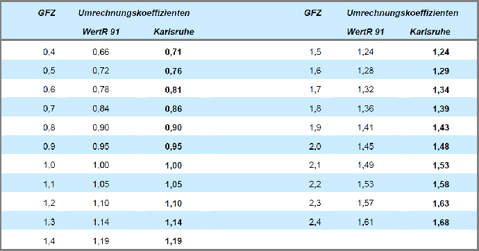 Für Grundstücke der Grundstückstypen 20, 30, 35, 40, 45 und 46 werden für die Umrechnung der Wertverhältnisse bei unterschiedlicher baulicher Nutzung (GFZ:GFZ) die Karlsruher Umrechnungskoeffizienten verwendet. Hierbei können für bestimmte Bereiche der Geschossflächenzahlen abweichende Wertverhältnisse zutreffend sein.